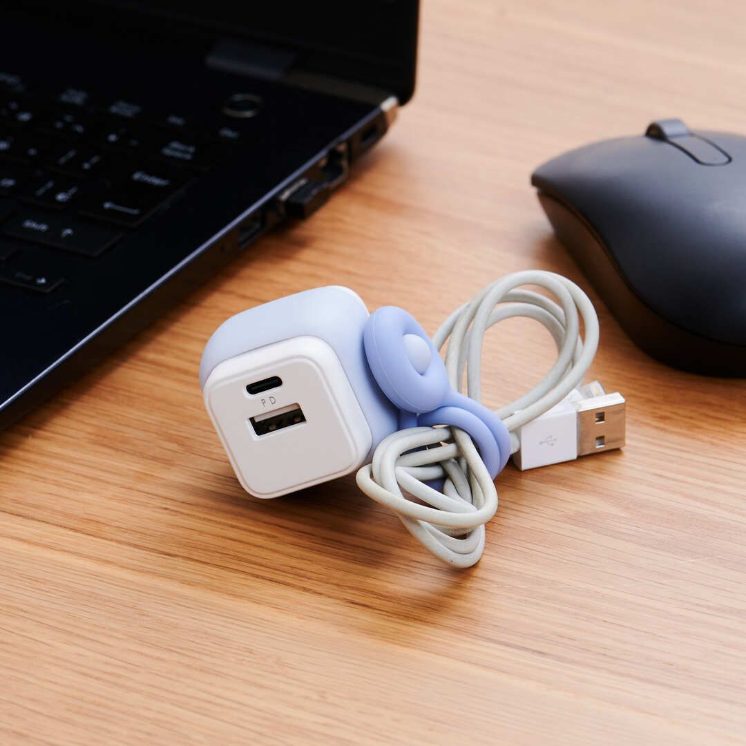 すっきりまとまるケーブルリングシリコン素材のケーブルリングは、ケーブルをまとめてくれる役割と、コードを浮かせて床につかないようにしてくれる役割をしてくれます。