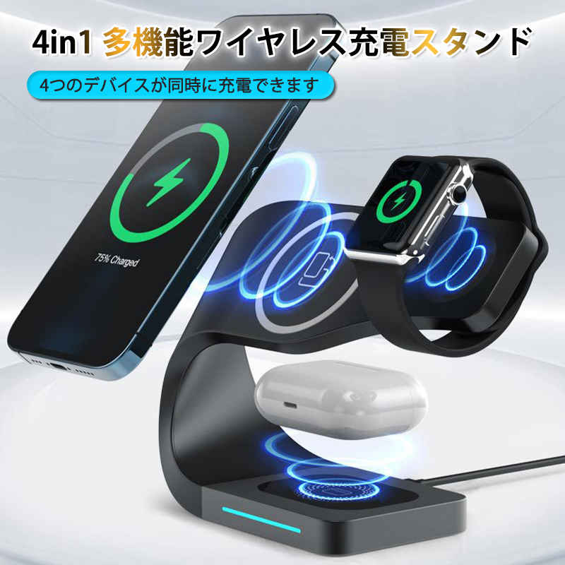 | ワイヤレス充電器 4in1 ワイヤレスチャージ 充電ドック マルチ 充電ステーション Qi Dock式 ドック式 アンドロイド iPhone Micro Type-C 急速 apple watch 4 5 6 SE airpods 2台 同時充電 急速充電 Qi対応 10w 置くだけ 充電スタンド