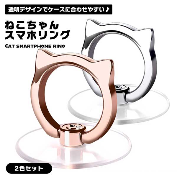 | スマホリング おしゃれ 透明 かわいい ねこ 猫 ネコ 落下防止 ホールドリング 薄型 スタンド 車載ホルダー 360回転 iPhone Android ゴールド シルバー 2色セット 送料無料
