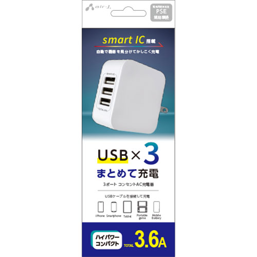 エアージェイ AC・充電器(モバイル) 【3個セット】 3ポート3.6A AC充電器 WH(AKJ-36AD3-WHX3) 取り寄せ商品