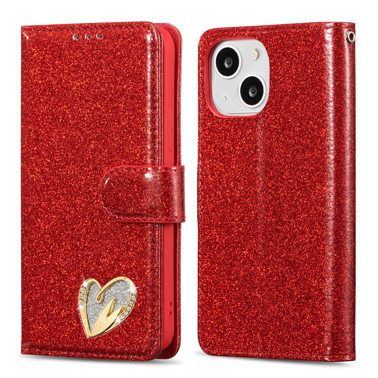 QLTYPRI iPhone 14 6.1 inch ケース 手帳型 PU キラキラ カード収納 横置き Qi充電 全面保護 ストラップ付き - レッド