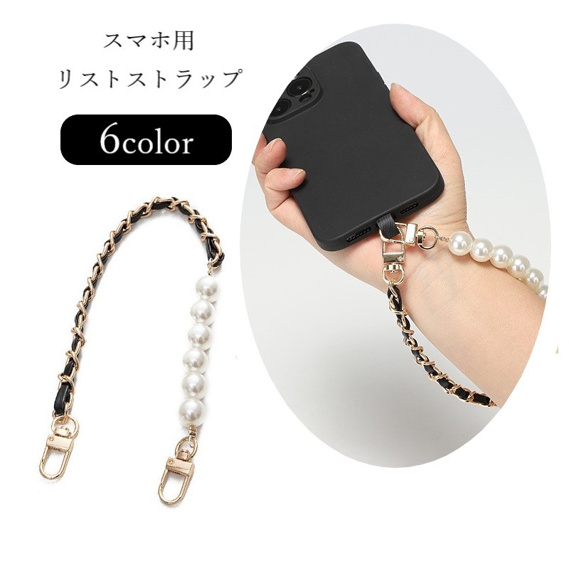 | 送料無料 スマホ用リストストラップ スマホ用ハンドストラップ レディース 女性 メンズ スマホ用アクセサリー スマホ関連雑貨 iPhone Android チェーン フェイクパール ナスカン 落下防止 紛失防止 フェイクパール PUレザー ブラック ホワイト ピンク ゴールドカラー シンプ