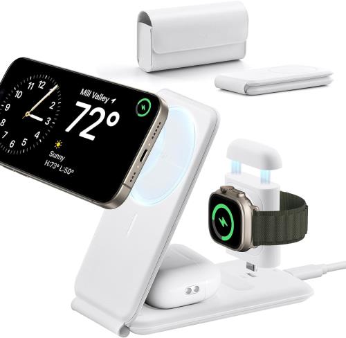 | ESR 3in1 MagSafe充電器 折りたたみ式磁気ワイヤレス充電器 MFi認証 Apple Watch公認充電器 トラベル充電ステーション(HaloLock) 持ち運び可能アップルウォッチ充電器 iPhone 16/15/14/13/12用 AirPods 4/3/AirPods Pro用 調節可能な2wayスタンド バッグ付き ホワイト