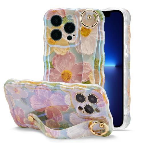QLTYPRI iPhone 15 Pro Max 用 ケース TPUカバー ウェーブ おしゃれ 韓国 可愛い 花柄 薄型 軽量 耐衝撃 スマホケース ハンドベルト付き カラビナリング付き スタンド機能 ワイヤレス充電対応 ストラップホール付き アイフォン15 Pro Max ケース 6.7インチ 対応 - グリーン
