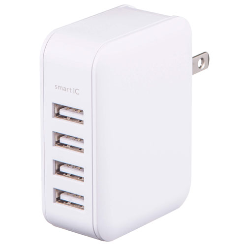 100-240V出力電圧:5V出力電流:4.8A海外対応:-メーカー保証:0.5年外形寸法:幅26x高さ50x奥行66mm質量:78.9g付属品: 保証書コンセントからiPhoneやスマートフォンを同時4台まで充電できる