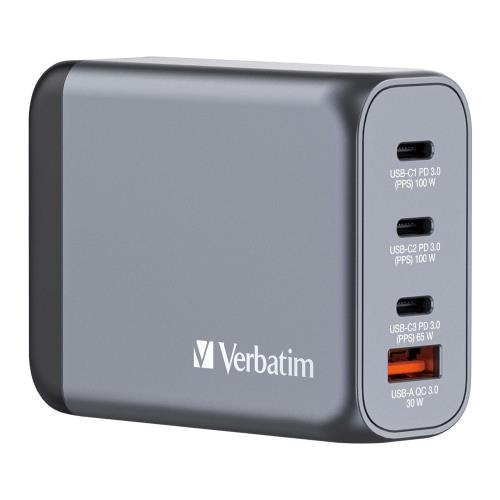 Verbatim(バーベイタム) PD100W対応 海外使用対応 チャージャー AC充電器 USB x4ポート装備 (USB-C x3、USB-A x1)32202 次世代素材GaN採用 急速充電(PPS)対応 ACアダプター 新型GaN 窒化ガリウム採用 PSE技術基準適合 折りたたみ式プラグ ブラック&グレイ